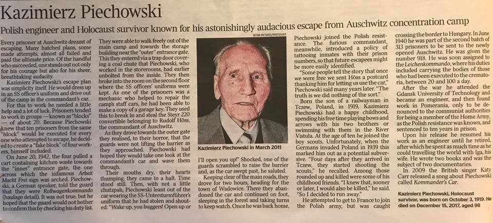 Piechowski received numerous accolades for his bravery and contributions to Poland until his death at 98 years of age on 15 December 2017.