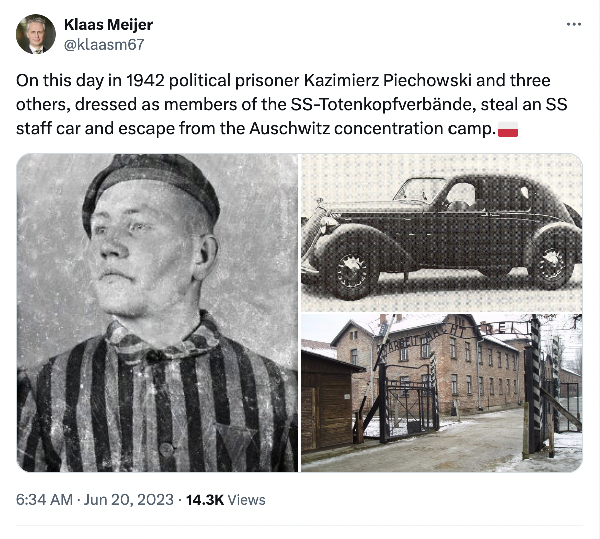 On 20 June 1942, Piechowski, along with three other prisoners—Eugeniusz Bendera, Stanisław Jaster, and Józef Lempart—executed one of the most daring escapes in history. Disguised in stolen SS uniforms and armed with weapons from the camp’s armoury, the group commandeered an SS staff car. With nerves of steel, they bluffed their way through the camp’s main gate.
