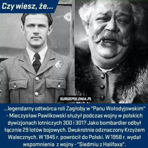 100 lat temu, 9 stycznia 1920 roku w Żytomierzu urodził się Mieczysław Pawlikowski – polski pilot wojskowy, aktor, pisarz i poeta. Jest powszechnie znany jako filmowy Jan Zagłoba z Trylogii Henryka Sienkiewicza. Ale mało kto zdaje sobie sprawę, że Pawlikowski oprócz tego, że był cenionym aktorem, w czasie wojny był bombardierem Dywizjonu 300 i 301. Łącznie wykonał 29 lotów bojowych a kilkakrotnie był też nad Polską zrzucając cichociemnych.