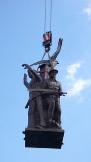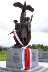 The Polish Sculptor Robert Sobociński was chosen. Based in Poland, he had his own foundry and was able to deliver the finished monument from Poznań to Alrewas. The work in progress was reported back through photographs to an eager diaspora in the pages of The Dziennik Polski, (The Polish Daily). Historians and historical researchers contributed to the enormous task of explaining the WWII Battles where Polish Forces fought. Architects pondered how to create the monument’s entourage and walls, ground engineering specialists examined the terrain and technicians measured and chose the materials. The completed bronze placed in the ruins of Warsaw in 1944, included a pilot, a soldier, a seaman and a female home army AK soldier.