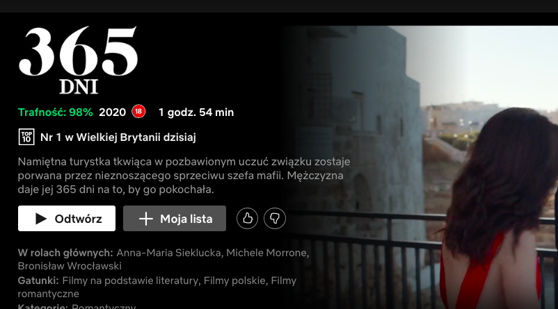Na szczycie brytyjskiej i amerykańskiej listy hitów na Netflixie pojawił się polski film „365 dni”. Filmu nie oglądaliśmy, ale jego wysoka pozycja w rankingu, szczególnie na tak konkurencyjnym rynku, wzbudziła nasze zainteresowanie.