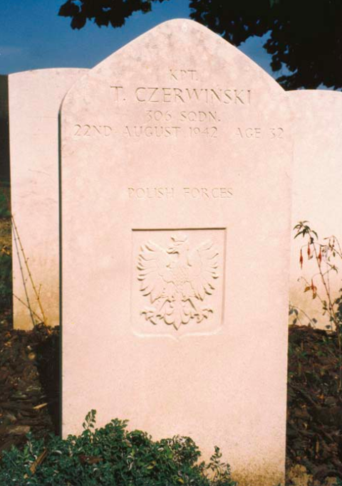 The squadron attacked St Omer airfield and Longuenesse on 22nd August 1942 and encountered heavy ground fire. Czerwiński was last seen in an uncontrolled climb in Spitfire UZ-C EN826. His body was subsequently recovered and he is buried in Souvenir-Longuenesse Cemetery in St. Omer.