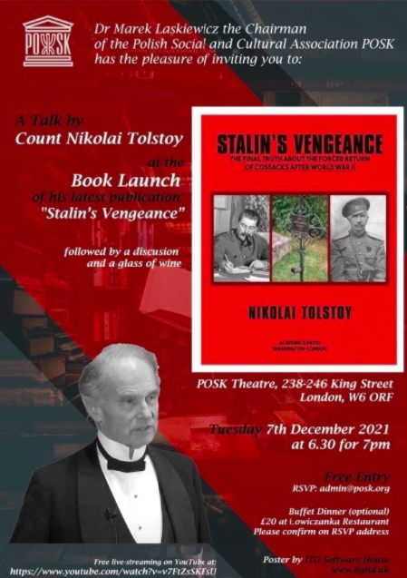 Dr Marek Laskiewicz the Chairman of the Polish Social & Cultural Association has the pleasure of inviting you to: A talk by Count Nikolay Tolstoy at the book launch of his latest publication „Stalin’s Vengeance”.
