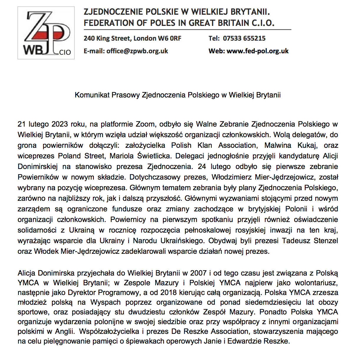 Zjednoczenie Polskie w Wielkiej Brytanii ZPWB (ang. Federation of Poles in Great Britain) na swoim ostatnim Walnym Zebraniu dało przykład, jak odmładzać struktury polskich organizacji polonijnych. Nowym prezesem organizacji została Alicja Donimirska, dotychczasowa prezes Fundacji Polska YMCA w Wielkiej Brytanii.