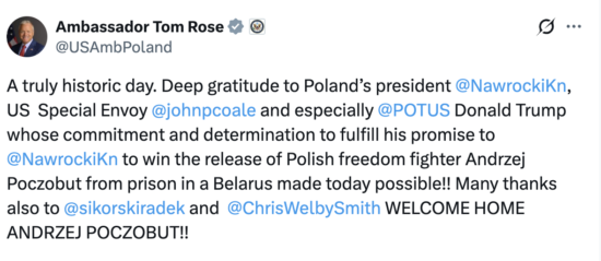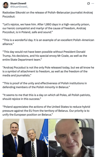 Coale revealed that Trump personally urged him to ensure Poczobut’s release. While negotiations proved lengthy and difficult, persistence eventually paid off. Notably, unlike previous cases involving political prisoners in Belarus, no additional sanctions relief was offered in exchange highlighting a firmer stance by Western actors.