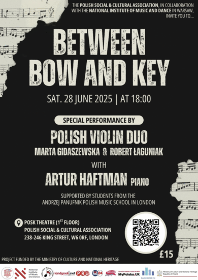 Polski Duet Skrzypcowy, w składzie Marta Gidaszewska i Robert Łaguniak zagra u boku pianisty Artura Haftmana. Polski Ośrodek Społeczno-Kulturalny w Londynie i Narodowy Instytut Muzyki i Tańca zaprasza na niezwykły wieczór muzyczny z udziałem uznanego polskiego duetu skrzypcowego, w skład którego wchodzą Marta Gidaszewska i Robert Łaguniak.