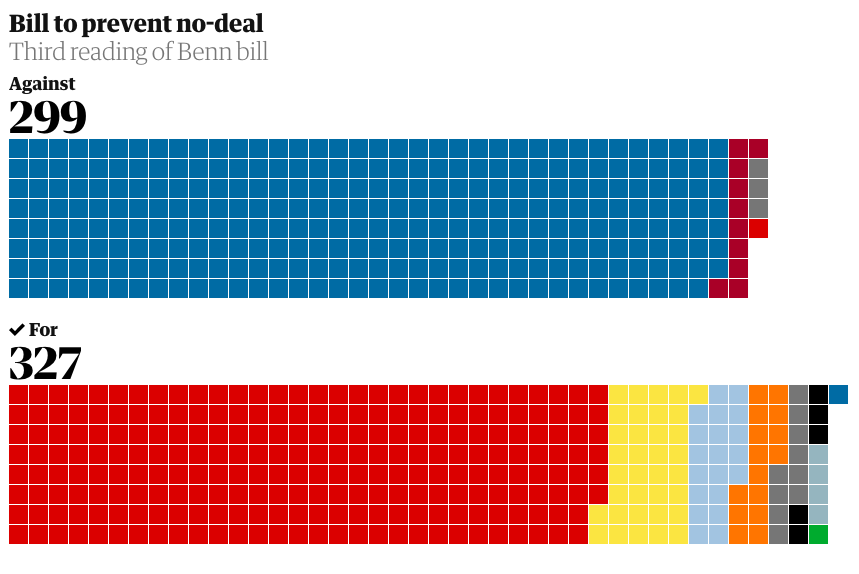 Ustawa zmusza premiera do złożenia wniosku o przesunięcie terminu Brexitu, jeśli umowa nie zostanie uzgodniona z UE. Wniosek trafi następnie do Izby Lordów do zatwierdzenia w czwartek. Jeśli tam pojawią się jakiekolwiek poprawki, wniosek będzie musiał powrócić do Izby Gmin w celu zatwierdzenia. Zwolennicy Brexitu już zgłosili ponad 100 poprawek. Dopiero gdy przejdzie on wszystkie etapy, otrzyma Królewską Zgodę od Królowej (zgodnie z prawem).