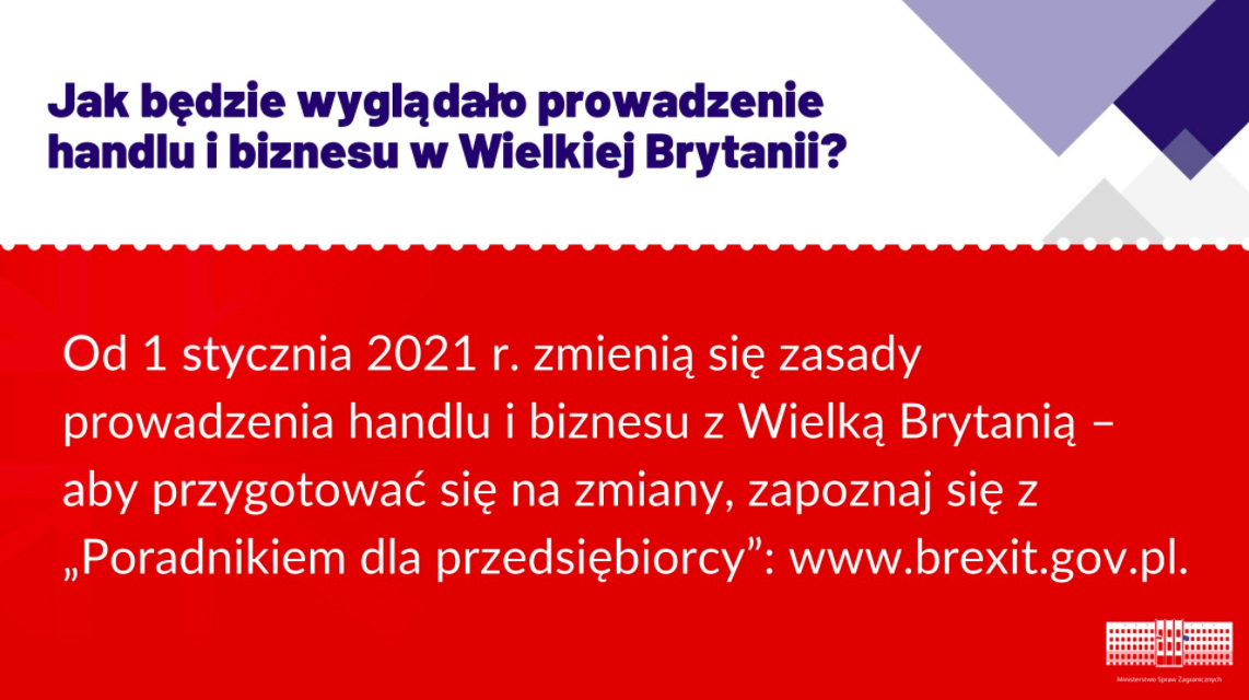 Pytania dotyczące skutków zakończenia okresu przejściowego w relacjach Unia Europejska – Wielka Brytania wraz z 1 stycznia 2021 roku można zadawać pod adresem mailowym: brexit@mr.gov.pl