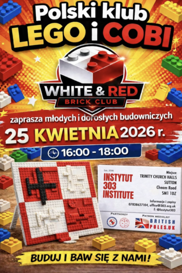 Instytut 303 (303 Polish Association CIC) zaprasza na kolejne spotkanie WHITE & RED BRICK CLUB, czyli Polskiego Klubu Miłośników Klocków LEGO i COBI. Wydarzenie odbędzie się we wtorek, 7 kwietnia w godzinach 15:00 – 17:00 w południowym Londynie, w dzielnicy Sutton w budynku Trinity Church, i skierowane jest zarówno do dzieci, jak i dorosłych.