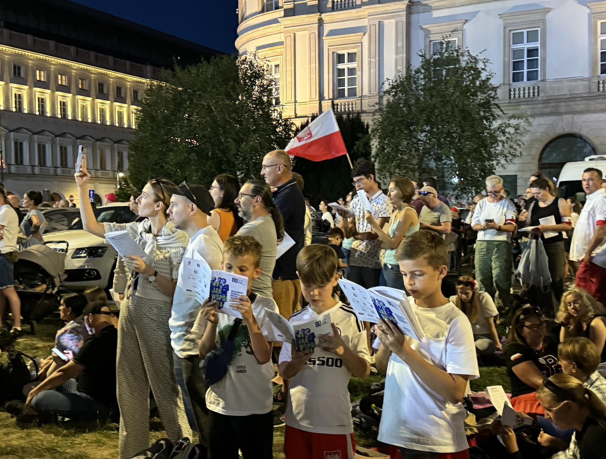 Already before 8.30 p.m., all those gathered took out the Songbooks printed and distributed by the Warsaw Uprising Museum. The repertoire was impressive, including : „Siekiera, motyka”, „Piosenka o mojej Warszawie”, „Marsz Mokotowa”, „Dziś idę walczyć – Mamo!”, „Hymn Szarych Szeregów”, „Hej chłopcy, bagnet na broń”, „Pałacyk Michla” or „Warszawskie dzieci”.