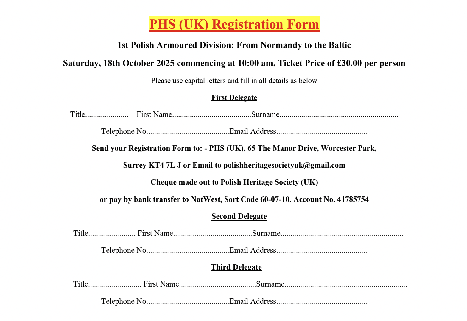 Cheque made out to: Polish Heritage Society (UK) or pay by bank transfer to Nat West, PHS UK A/C: Sort Code: 60-07-10. Account No: 41785754