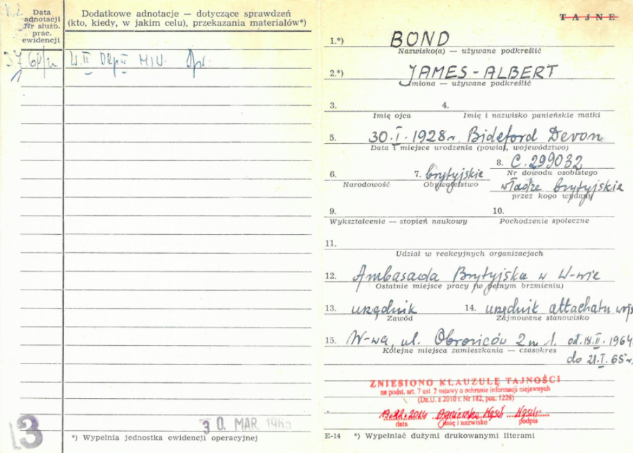 James Albert Bond from Devon came to Warsaw in February 1964 with his wife and six-year-old son, to take the position of a secretary-cum-archivist to the military attaché at the British Embassy. During his time here he made a few trips to northeast Poland, accompanying senior staff of the local SIS (Secret Intelligence Service) station, allegedly to gather information on military facilities there. As an imperialist diplomat, Bond was automatically put under surveillance by Department II (Counter-intelligence) of the Ministry of Internal Affairs, which noted his talkativeness, caution and penchant for women. They recorded little more: within ten months, the man sent his family back home, and a couple of weeks later departed himself, never to return.