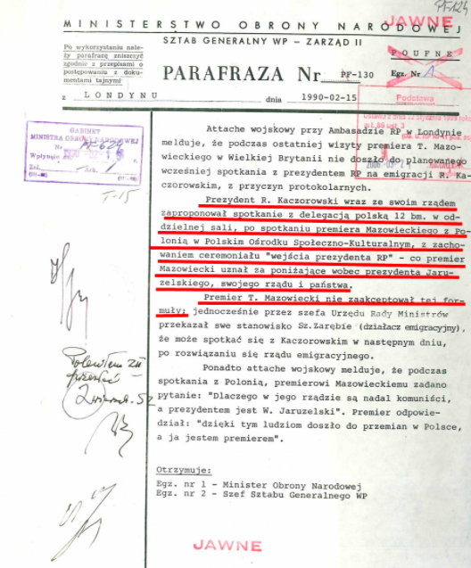 W zamieszczonym na stronie i mediach społecznościowych WBH dokumencie z 12 lutego 1990 r. czytamy, że „podczas ostatniej wizyty premiera T. Mazowieckiego w Wielkiej Brytanii nie doszło do planowanego wcześniej spotkania z prezydentem RP na emigracji R. Kaczorowskim, z przyczyn protokolarnych”.