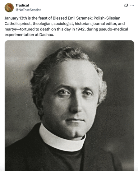Father Emil Michael Szramek (29 September 1887 – 13 January 1942) was a Polish Roman Catholic priest, scholar, cultural activist and martyr of the German Nazi regime, remembered today as one of the 108 Blessed Martyrs of World War II. He was born in the Silesian village of Tworków, near Racibórz, into a modest farming family. His father, Augustyn, left to seek work in the United States when Emil was still a boy, which left his mother, Józefa, to raise the children. It was she who instilled in him a deep sense of faith, moral duty and attachment to the land of his birth.