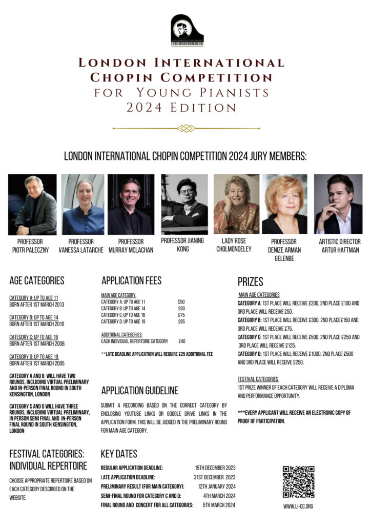 All proceeds from ticket sales will go towards the 2024 London International Chopin Competition for Young Pianists. (in March 2024).