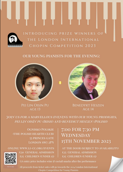 We are delighted to announce the fundraising concert on the 15th November with two young prodigies, Benedykt Heszen (age 14) and Pei Lin Oísin Piu (age 13) – prizewinners of 2023 London International Chopin Competition for Young Pianists.