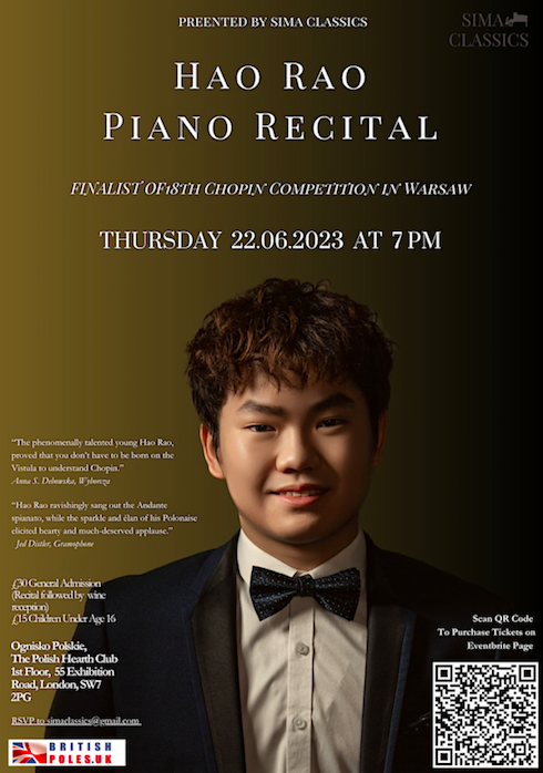 The recital will take place at the Polish Hearth Club in South Kensington, London, on 22nd June. The programme will include works by F. Chopin.