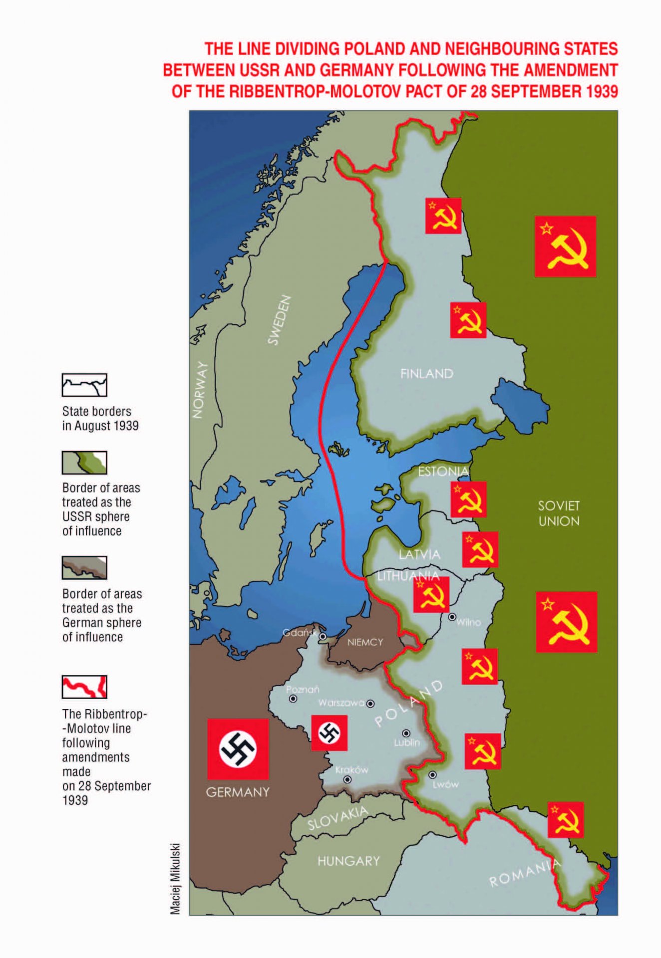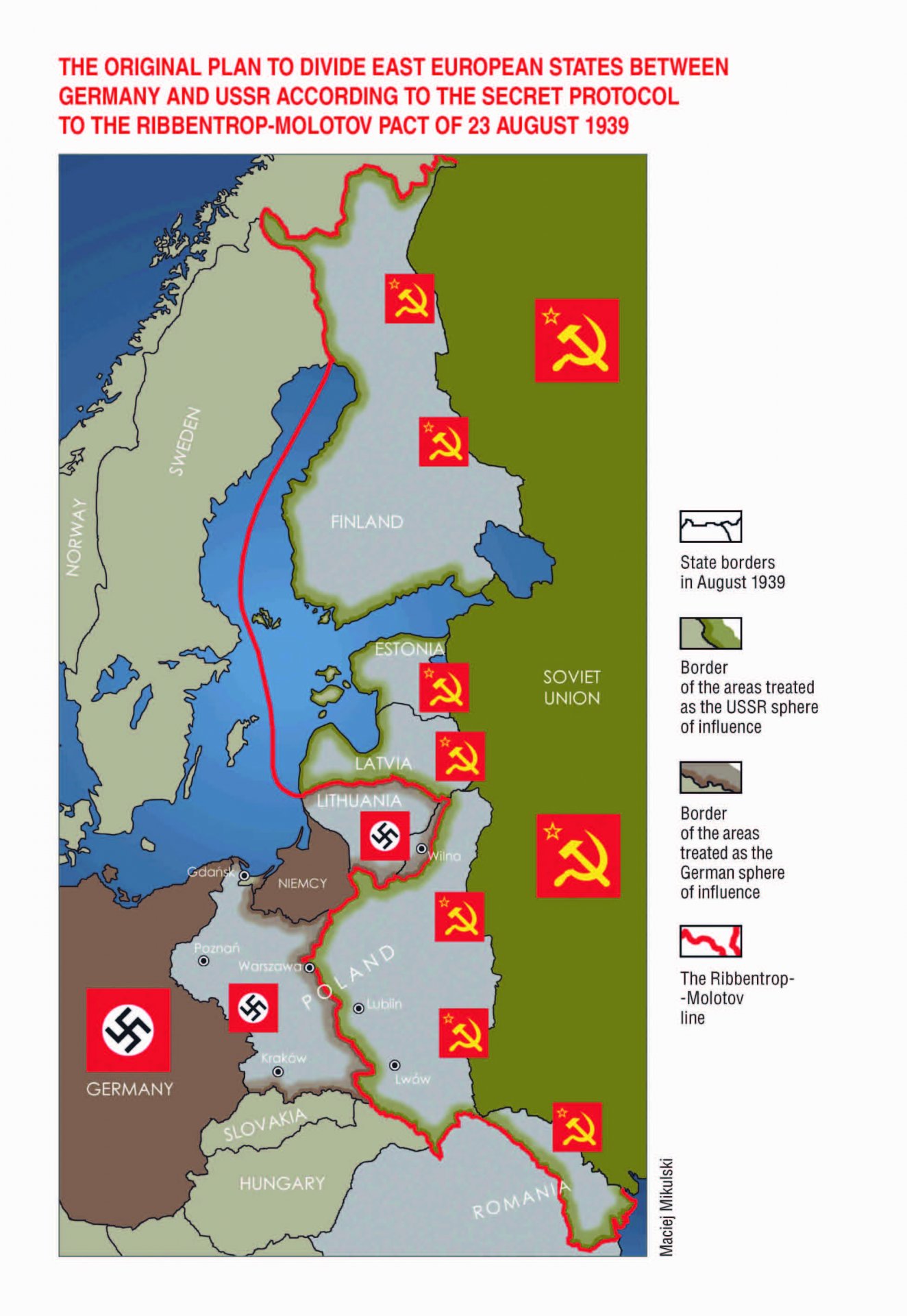 A mutual agreement of the German Reich and the USSR of 23 August 1939,  known as the Molotov-Ribbentrop Pact constituted the introduction to armed aggression. Only in the non-classified part did this agreement really have the form of a non-aggression pact. The term „non-aggression pact” was to deliberately mislead the international public into believing it to be a real agreement of this type concluded in Europe at the time. The essence of the collusion of the two aggressors was a secret protocol signed as part of the pact, which contained provisions on the division of spheres of influence, aimed at seizing the territories of independent states: Poland, Lithuania, Latvia, Estonia, Finland and Romania. It is, in fact, the secret protocol that actually made the agreement the foundation of the aggression of both countries that began in September 1939.