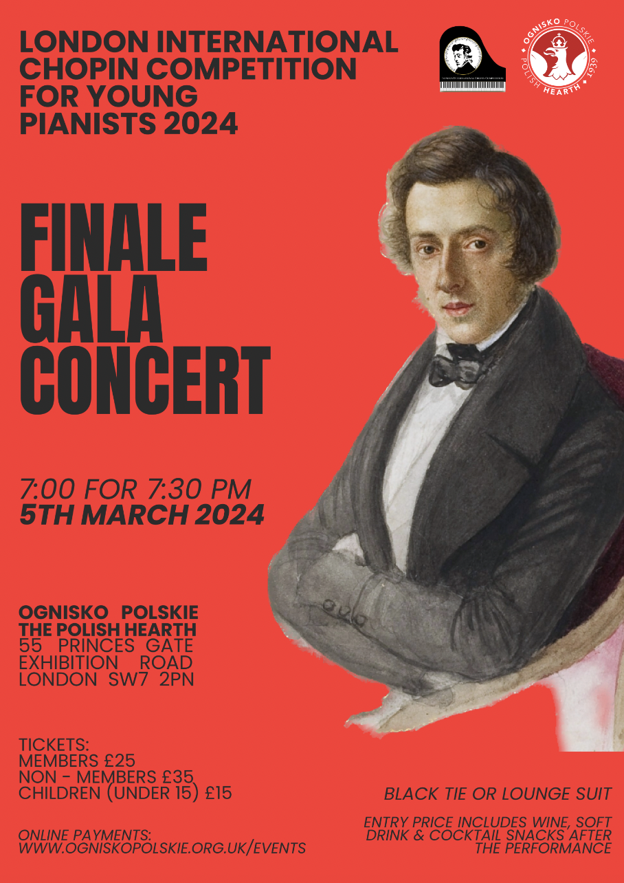 The final round of the 2024 edition of the London International Chopin Competition for Young Pianists takes place at Ognisko Poliskie – the Polish Hearth on Wednesday 5 March 2024.