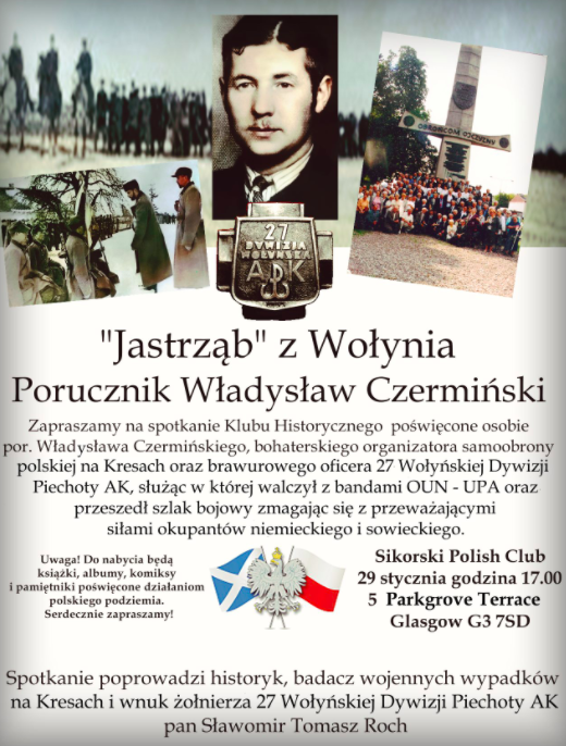 Polski Klub Historyczny w Glasgow zaprasza na spotkanie poświęcone osobie porucznika Władysława Czermińskiego, organizatora samoobrony polskiej na Wołyniu, opierającej się zbrodniczej działaności ukraińskich nacjonalistów OUN – UPA oraz oficera 27 Wołyńskiej Dywizji Piechoty AK, wraz z którą przeszedł szlak bojowy zmagając się z przeważającymi siłami okupanta niemieckiego i sowieckiego.