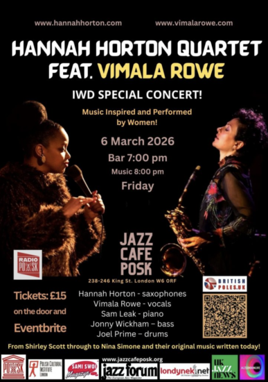 Zapraszamy na specjalny koncert z okazji Międzynarodowego Dnia Kobiet w Jazz Café POSK! Hannah Horton Quartet wystąpi z udziałem Vimali Rowe: Muzyka inspirowana i wykonywana przez kobiety.
