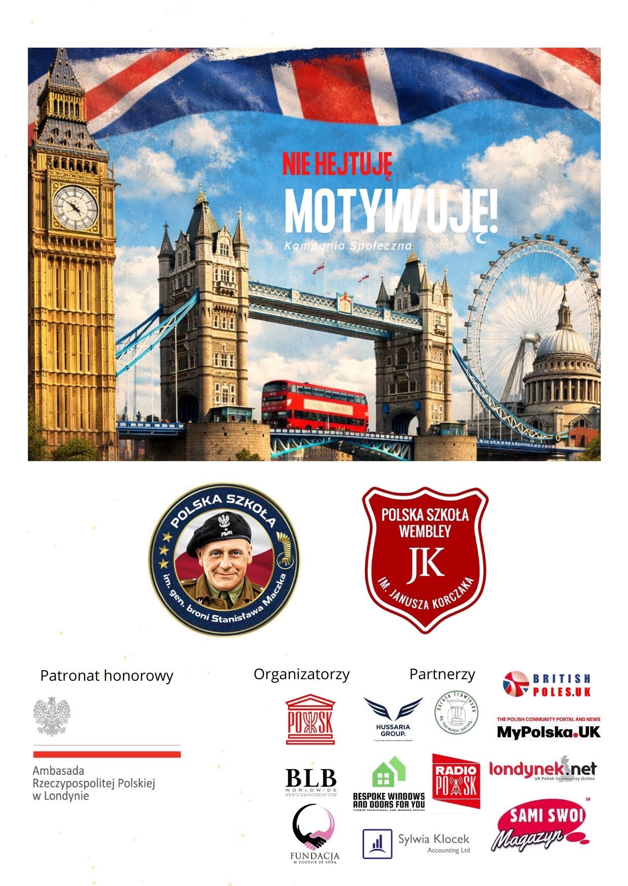 Kampania społeczna „Nie hejtuję – motywuję” po raz drugi zawita do Londynu! Już 25–26 kwietnia 2026 r. zapraszamy dzieci, młodzież oraz dorosłych na wyjątkowe wydarzenie.