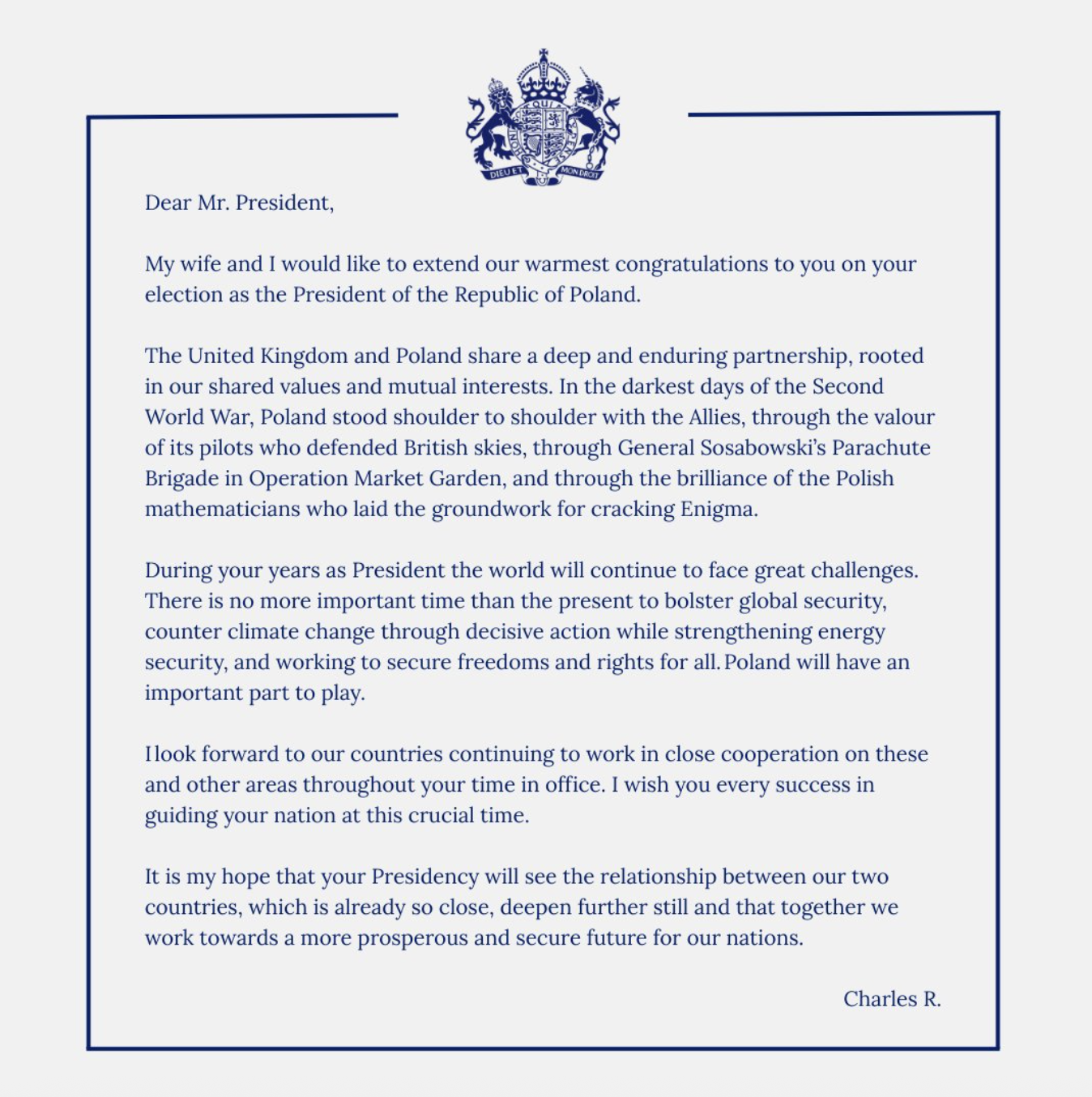 The British monarch expressed his hope that President Nawrocki’s term in office will deepen bilateral ties further. “I look forward to our countries continuing to work in close cooperation… throughout your time in office,” King Charles wrote, wishing Nawrocki “every success in guiding your nation at this crucial time.”