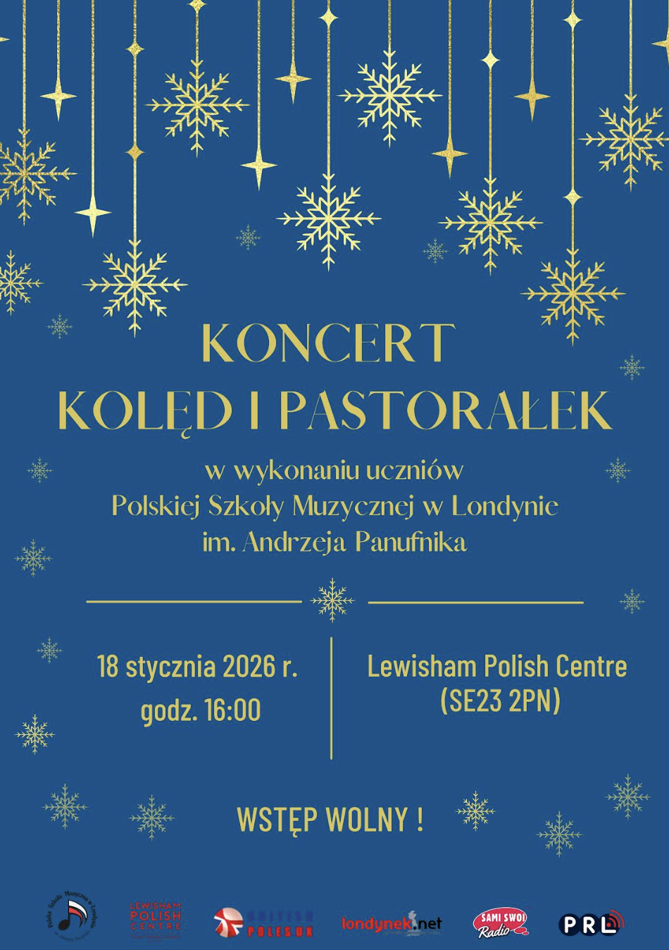 Polska Szkoła Muzyczna w Londynie im. Andrzeja Panufnika oraz Lewisham Polish Centre zapraszają serdecznie na Koncert Kolęd i Pastorałek, który odbędzie się w niedzielę 18 stycznia 2026 roku o godzinie 16:00.