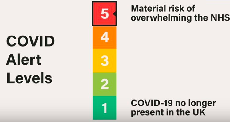 „Poziom pierwszy oznacza, że choroba nie występuje już w Wielkiej Brytanii, a poziom piąty jest najbardziej krytyczny”. W tej chwili jesteśmy na poziomie czwartym i zbliżamy się do trzeciego. Dlatego Wielka Brytania podejmuje „pierwsze ostrożne kroki, aby zmodyfikować ograniczenia.”