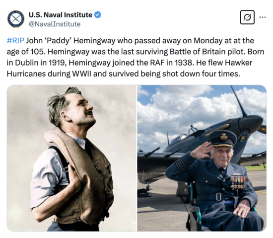 After the war, Hemingway lived in Canada but returned to Ireland in 2011. He was one of the nine surviving members of “The Few” in July 2018. After the death of William Clark in 2020, Hemingway became the last known surviving airman of the Battle of Britain.
