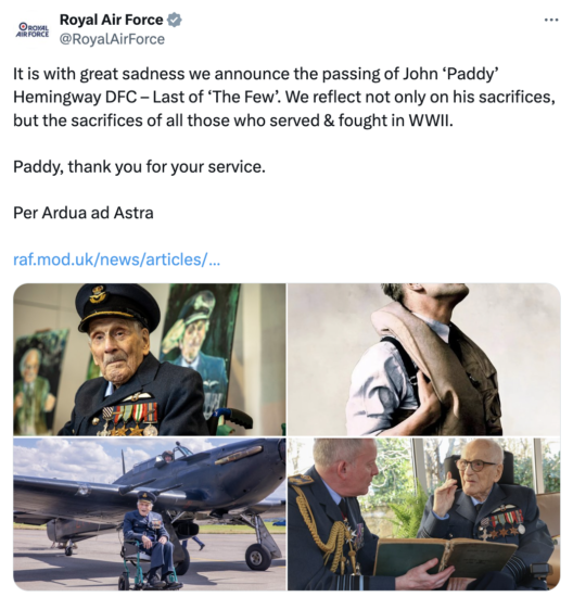 The last pilot to take part in the Battle of Britain, John ‘Paddy’ Hemingway, has died at the age of 105, as reported by the BBC.