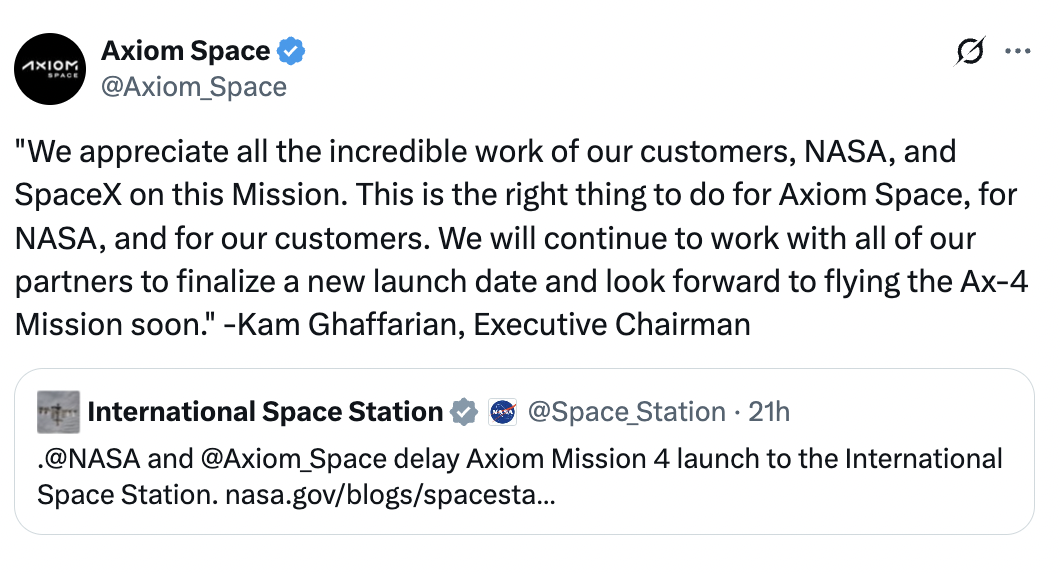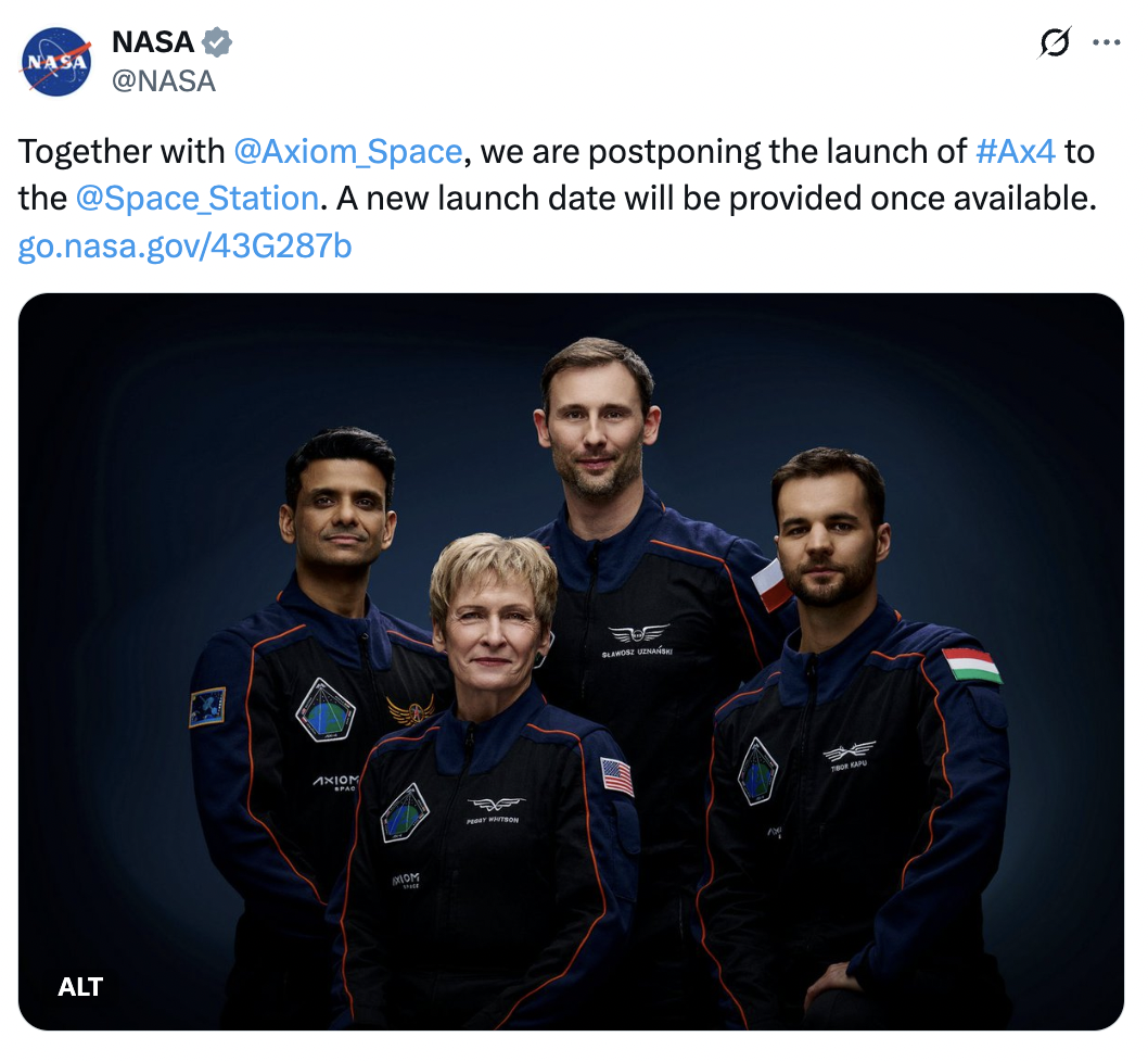 This marks the fourth time the Ax-4 mission has been postponed. The launch of SpaceX’s Falcon 9 rocket—tasked with delivering the crew aboard the Dragon capsule—was initially scheduled for 29 May, and later rescheduled to 8, 10, and then 12 June. Previous delays were attributed to high-altitude winds along the flight corridor, technical issues with the Dragon capsule, and a liquid oxygen (LOx) leak in the Falcon 9’s first stage.