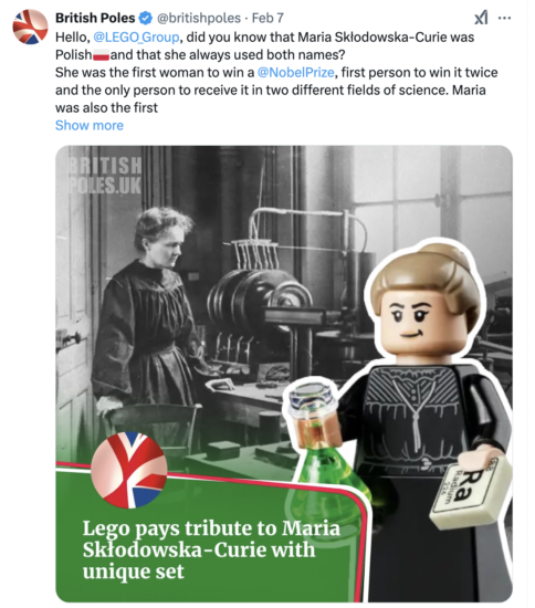 The Lego group decided to correct the description of their new set commemorating famous scientists including Maria Skłodowska-Curie. Before the change, they used only the French part of Maria’s surname and one she received from her French husband. The British Poles were one of the media that wrote about the mistake and called on Lego to correct their product’s description.