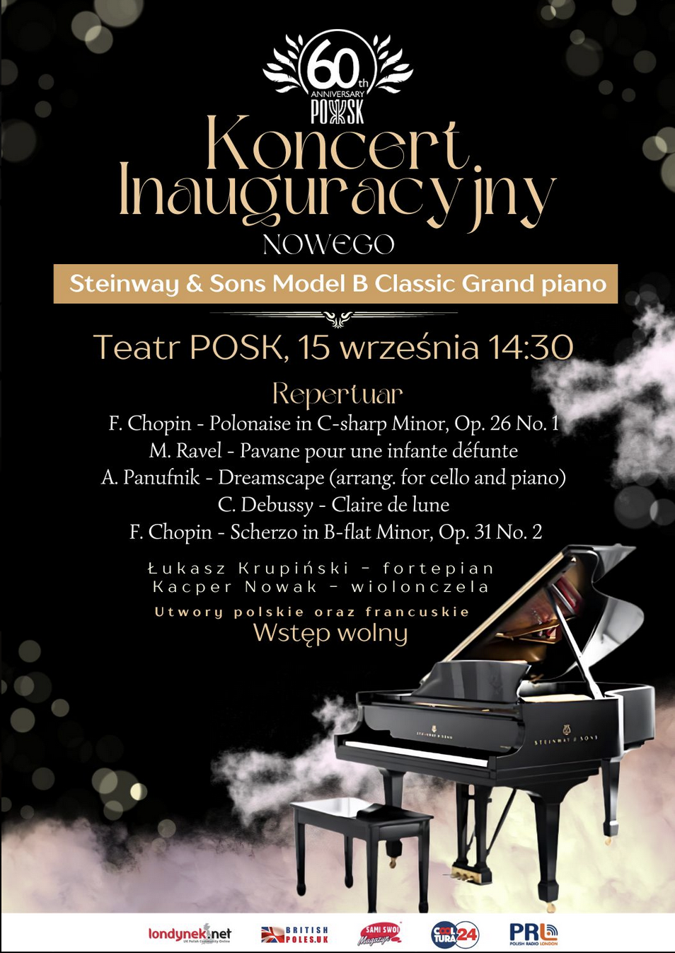 Już 15 września Polski Ośrodek Społeczno Kulturalny POSK w Londynie serdecznie zaprasza na Koncert Inauguracyjny nowego fortepianu Steinway & Sons w wykonaniu Łukasza Krupińskiego oraz Kacpra Nowaka.