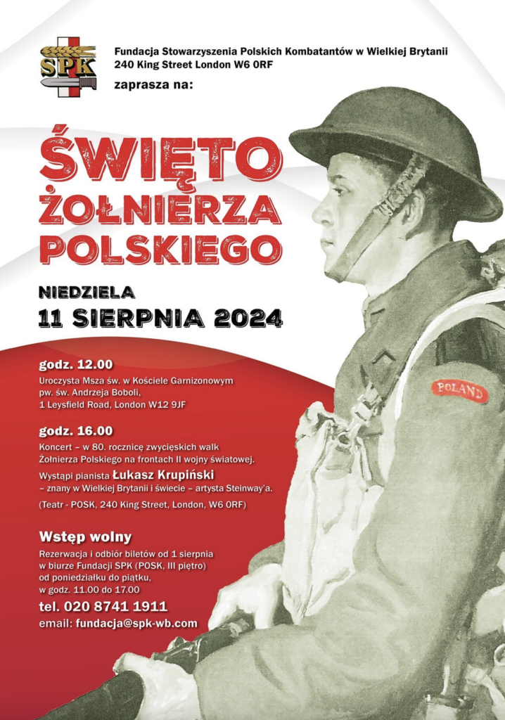 Święto Żołnierza Polskiego, organizowane przez SPK, odbędzie się w londyńskim POSK-u w niedzielę 11 sierpnia. Program jest wspaniały, a jego niewątpliwie największą atrakcją muzyczną będzie „chrzest” nowego fortepianu firmy Steinway, który właśnie został zakupiony przez POSK. I zagra na nim nikt inny, jak artysta Steinawaya – wybitny polski pianista mieszkający w Londynie, Łukasz Krupiński.