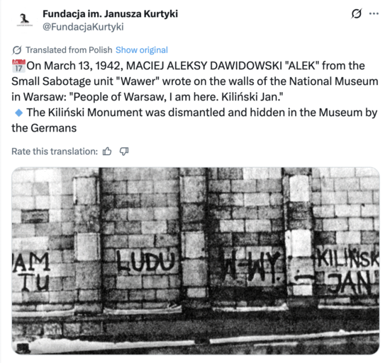 His pluck alone, disguised as a drunken passer-by, his hands unscrewing bolts, a brass slab crashing to the snowy pavement became a psychological blow to German occupation authorities, described by General Bór-Komorowski as “one of the best pranks” in the psychological war.
