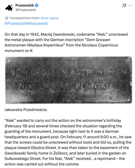 He undertook audacious missions notably on 11 February 1942, in broad daylight and under the nose of occupying forces, he quietly dismantled a German plaque from the Copernicus Monument in Warsaw.