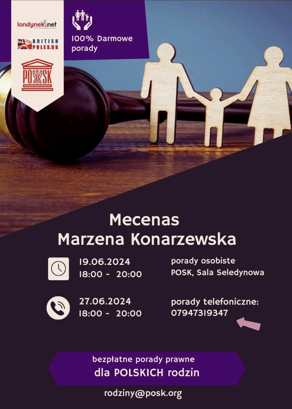 Już w środę, 19 czerwca 2024 w godzinach 18.00 – 20.00, Polski Ośrodek Społeczno-Kulturalny POSK bardzo serdecznie zaprasza na comiesięczne darmowe porady prawne dla Polaków w UK.