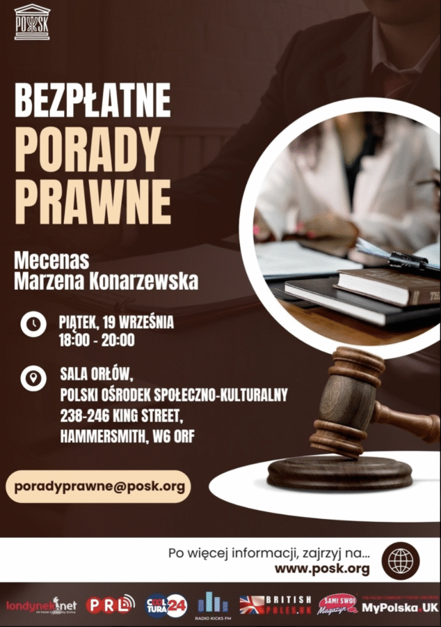 Już w piatek, 19 września 2025 w godzinach 18.00 – 20.00, Polski Ośrodek Społeczno-Kulturalny POSK serdecznie zaprasza na comiesięczne darmowe porady prawne dla Polaków w UK.