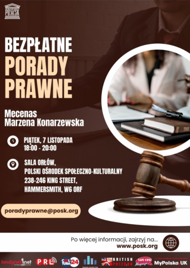 Już w piątek, 7 listopada 2025 w godzinach 18.00 – 20.00, Polski Ośrodek Społeczno-Kulturalny POSK serdecznie zaprasza na comiesięczne darmowe porady prawne dla Polaków w UK.