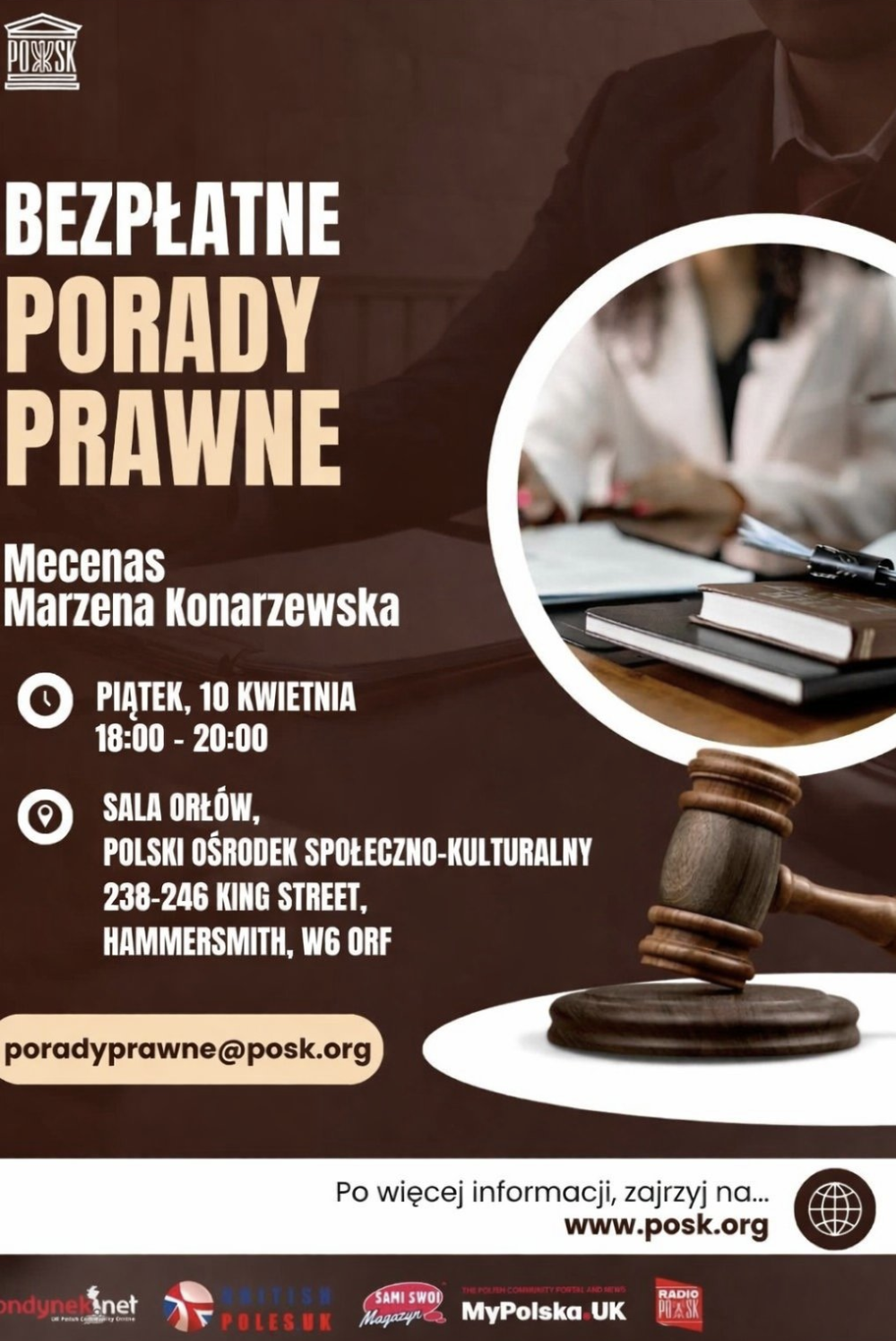 Już w piatek, 10 kwietnia 2026 w godzinach 18.00 – 20.00, Polski Ośrodek Społeczno-Kulturalny POSK serdecznie zaprasza na comiesięczne darmowe porady prawne dla Polaków w UK.