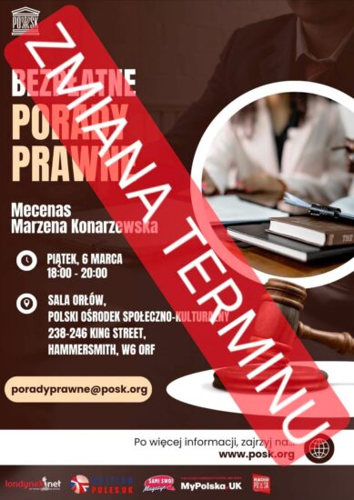 Niestety, z powodu choroby planowane na dzisiaj porady odbędą się dopiero 27 marca 2026 w godzinach 18.00 – 20.00. Polski Ośrodek Społeczno-Kulturalny POSK przeprasza za zmianę terminu i zaprasza na nowy termin comiesięcznych darmowych porad prawnych dla Polaków w UK.