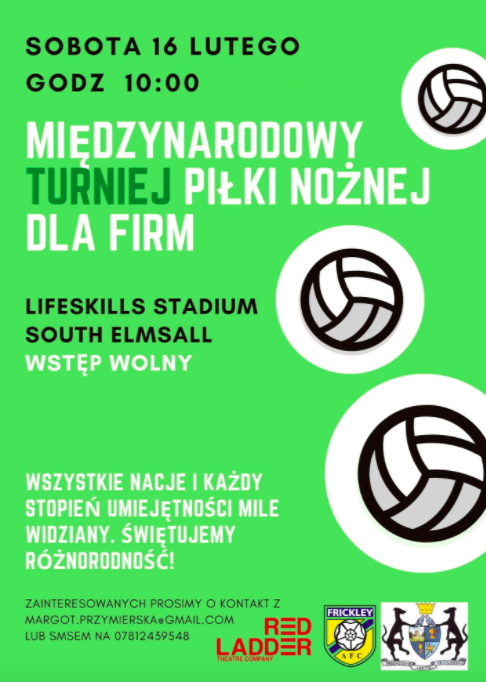 W niedzielę 16 lutego od godz. 10:00 zapraszamy w imieniu organizatorów na Międzynarodowy Turniej Piłki Nożnej dla pracowników lokalnych firm, który odbędzie się na profesjonalnym stadionie Life Skills Frickley Athletics w South Elmsall.