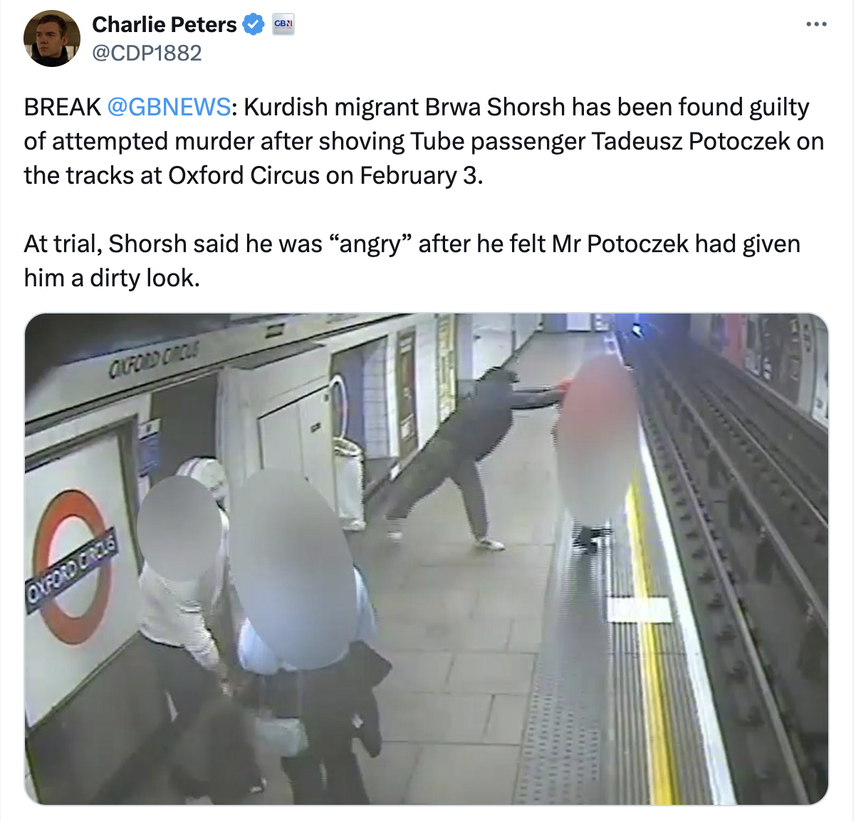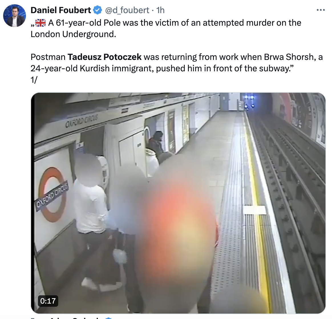 24-year-old Brwa Shorsh allegedly shoved Polish postman Tadeusz Potoczek off the platform at Oxford Circus station on February 3. As the perpetrator said the Pole gave him a “dirty look”. Mr Potoczek was on his way home via central London and looking up at a notice board when he was attacked.