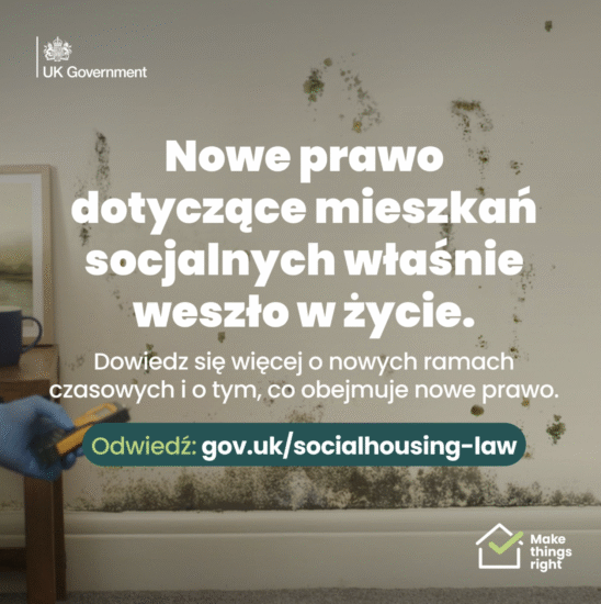 Aby dowiedzieć się więcej odwiedź stronę: www.gov.uk/socialhousing-law lub stronę kampanii w języku polskim: https://housinghub.campaign.gov.uk/make-things-right/home-page/