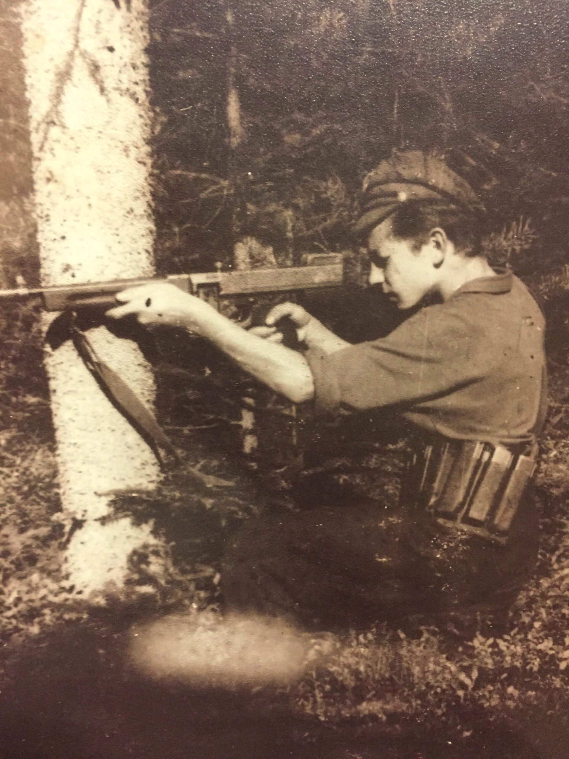 Sergiusz ze zdobyczą na plecach – potocznie zwanym „Bergmanem” czyli MP 28