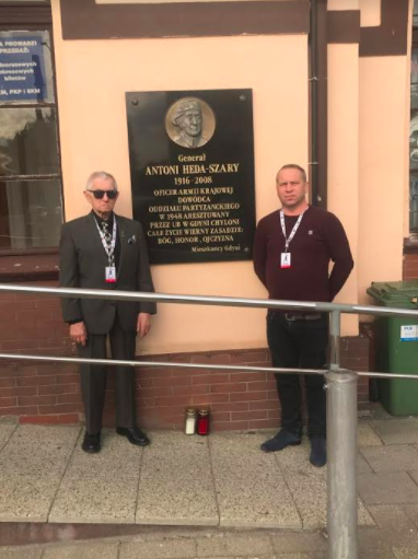 Sergiusz Papliński i Tomasz Muskus na tle tablicy upamiętniającej aresztowania gen. Hedy Szarego – Gdynia Chylonia, stacja PKP
