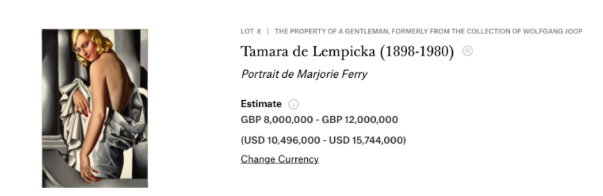 Jeden z najbardziej znanych obrazów polskiej malarki epoki art déco Tamary Łempickiej, „Portret Marjorie Ferry”, został sprzedany 5 lutego 2020 roku na aukcji „Impressionist and Modern Art” w londyńskim domu aukcyjnym Christie’s. Dzieło powstało w 1932 roku w studio artystki na rue Méchaini w Paryżu i jest najdrożej sprzedanym obrazem polskiego artysty w historii.