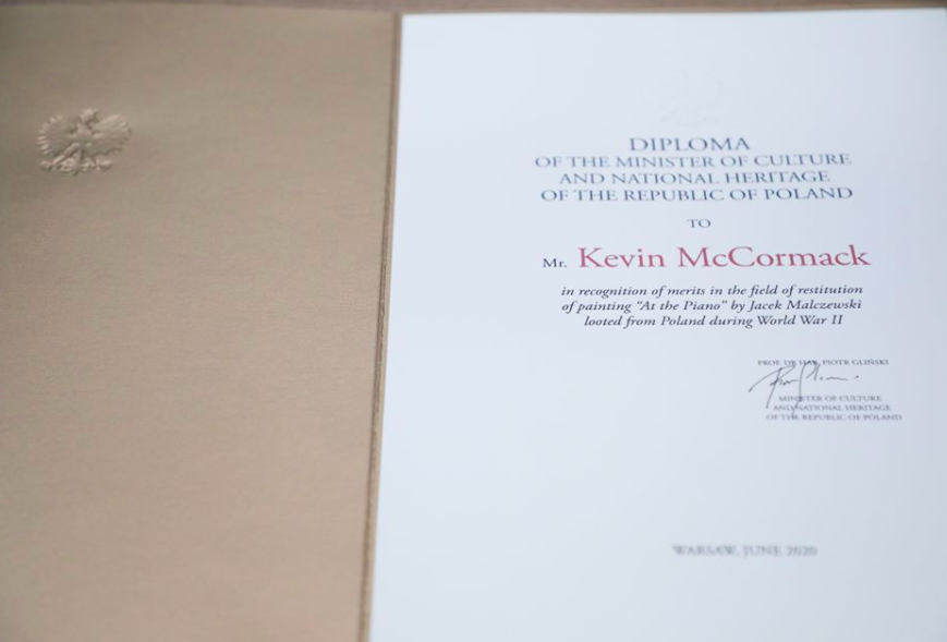 W wyniku negocjacji prowadzonych przez ministerstwo bezpośrednio z dotychczasowym posiadaczem, p. Kevinem McCormackiem, podjął on decyzję o dobrowolnym i bezwarunkowym zwrocie obrazu do Polski. Za ten gest, rzadko spotykany w praktyce restytucyjnej, p. McCormack został uhonorowany dyplomem Ministra Kultury i Dziedzictwa Narodowego.