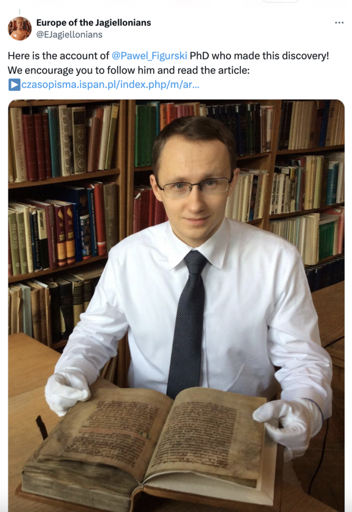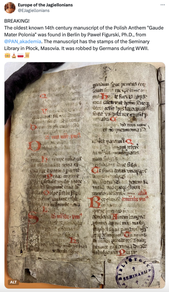 The oldest manuscript of a Polish religious hymn in honour of the patron of Poland St. Stanislaus was found in the Berlin city library archive by Dr Paweł Figurski. The manuscript bears the seals of the Catholic seminary library of Płock, but now the restitution process will begin. Poland will have to prove the rights for the manuscript that most likely was robbed during the World War 2.
